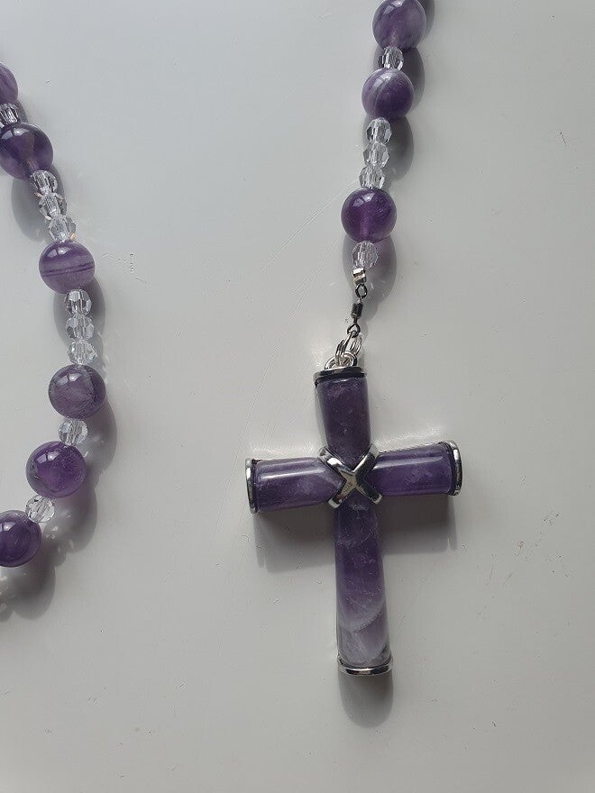 Rozenkrans - Paternoster met Halfedelsteen Amethist kruis en kralen & Swarovski kristallen.