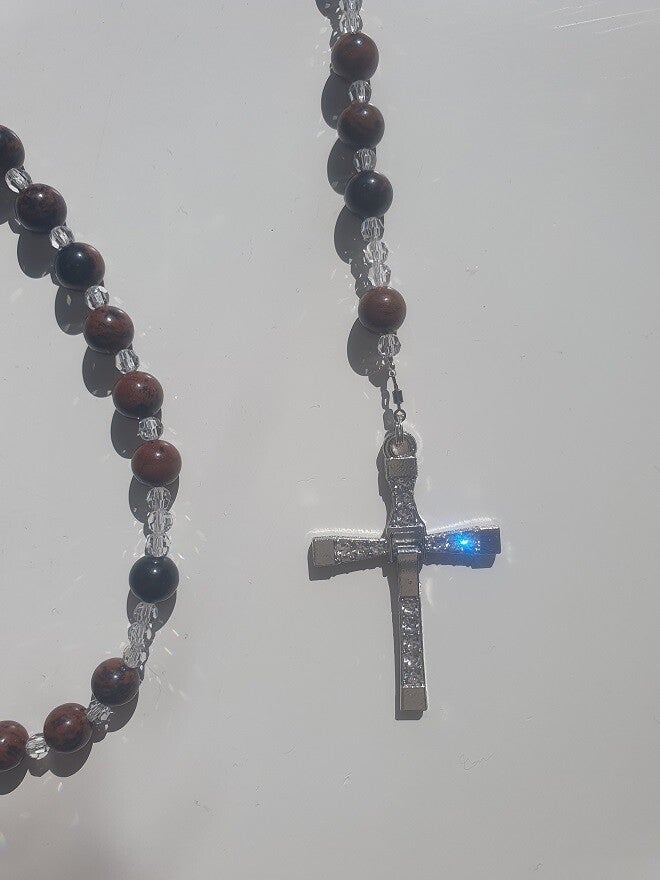 Door het gebruik met de kleur Bruine Obsidiaan in combinatie met het swarovski kristal heeft de rozenkrans een chique uitstraling.