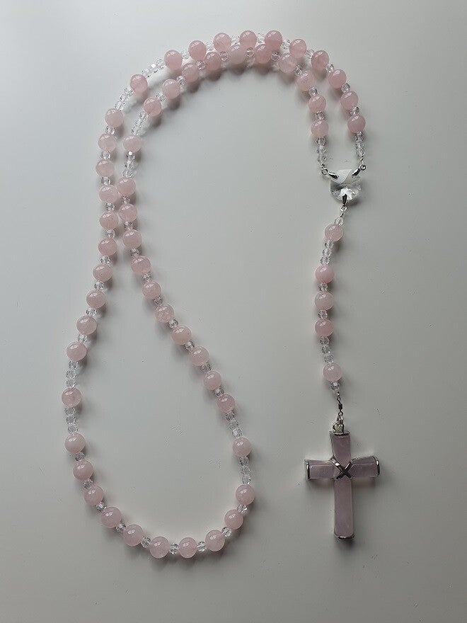 Rozenkrans - Paternoster met Halfedelsteen Rozenkwarts kruis en kralen & Swarovski kristallen.