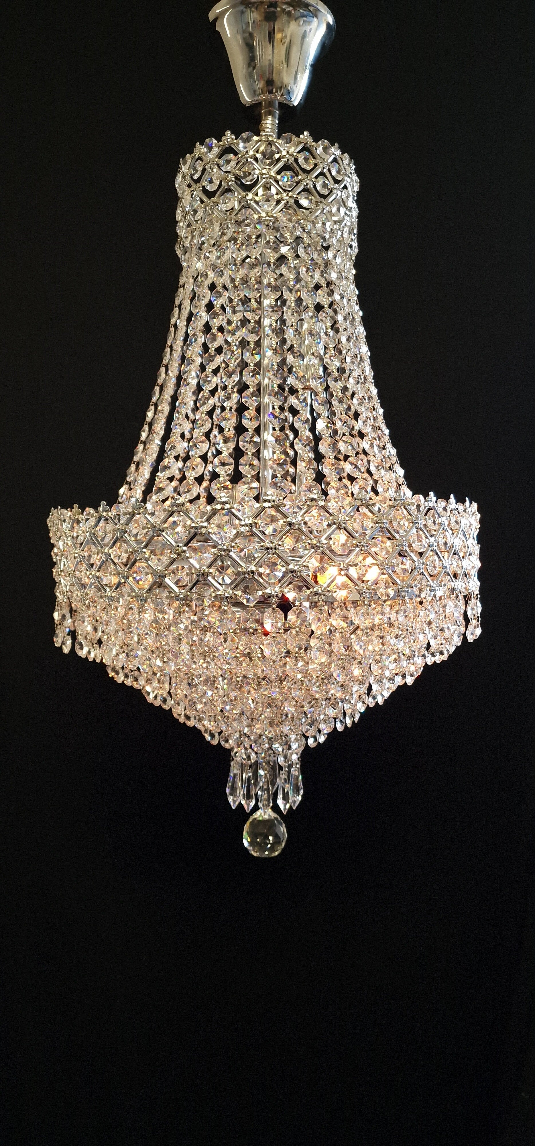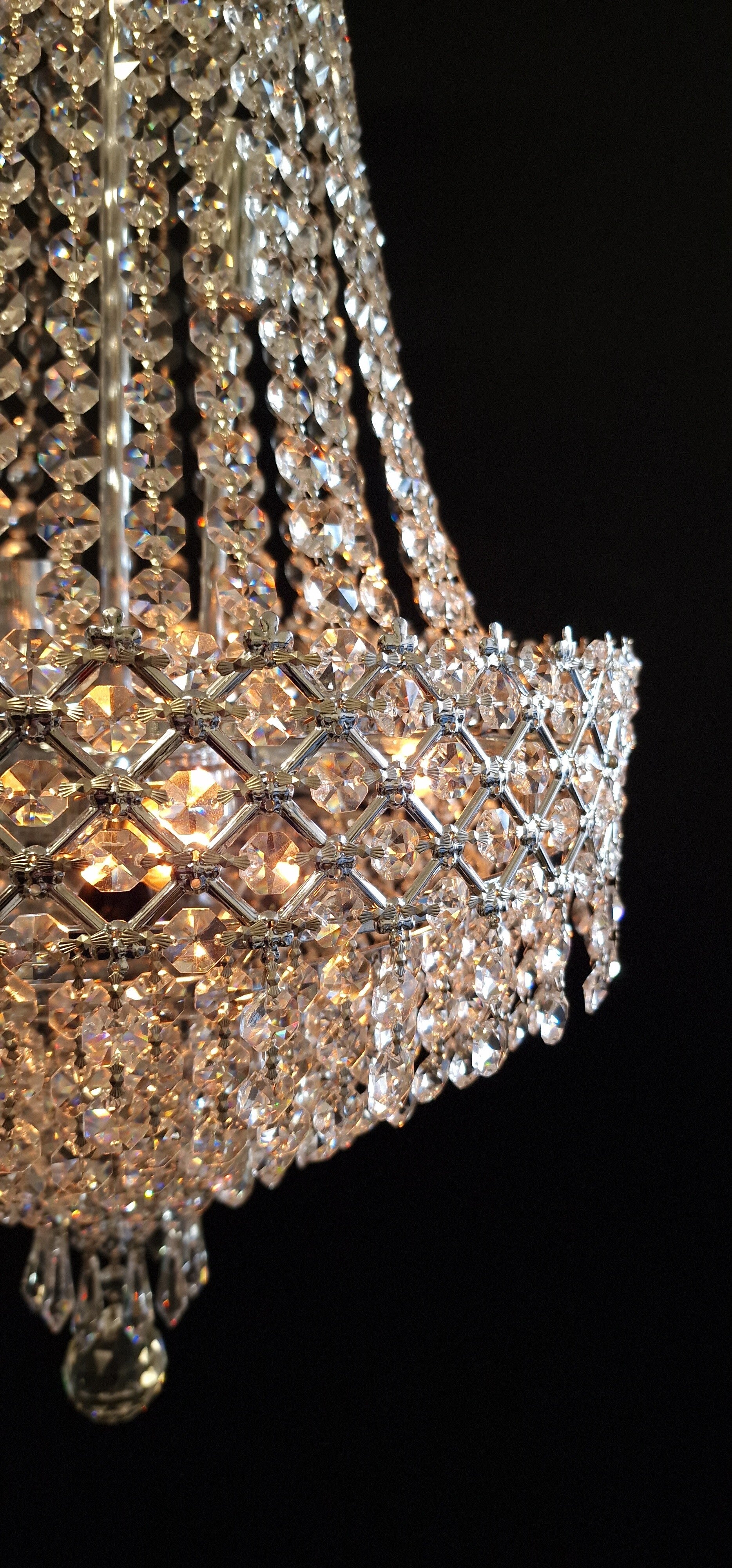 De kroonluchter is voorzien van nieuwe octagon zilver-kristallen van het A-merk Asfour. ( volloodkristal met een gehalte van 32% )