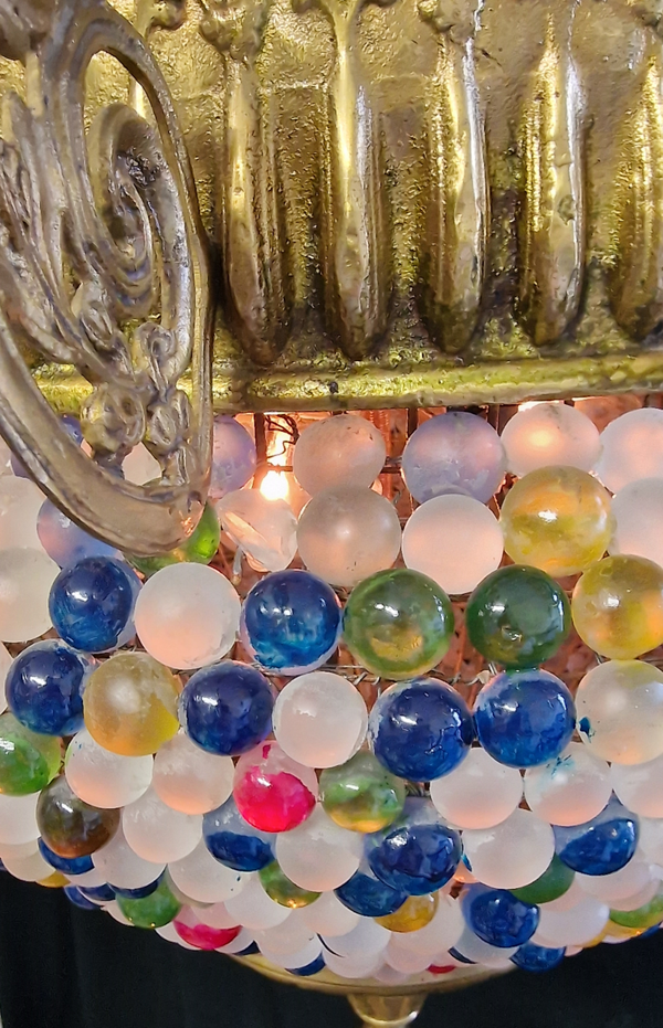Deze kroonluchter kom je zelden tegen, op wat ouderdom plekken na ziet de lamp er keurig uit.