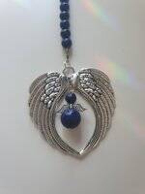 De Guardian Angel hanger is vervaardigt met half edelstenen van Lapis Lazuli en een Zilver kleurige grote vleugel, met daarin een bescherm engeltje van Lapis Lazuli. Deze hanger is opgebouwd met 9 Lapis Lazuli kralen van 8mm, 2 kristallen kralen van Swarovski, en een zilver kleurige ketting met slotje van 33 cm.
