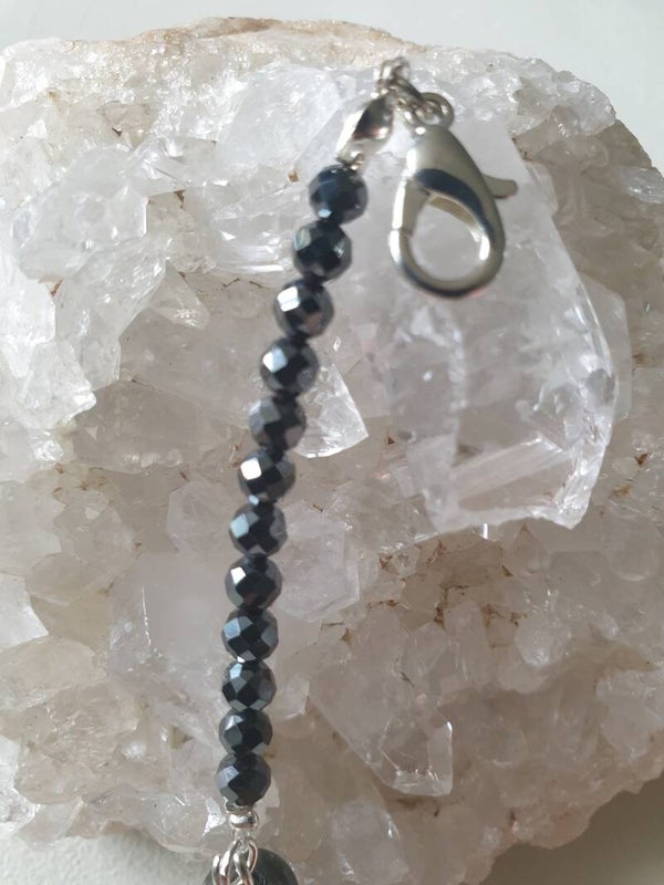 Heeft aan de boven zijde 11 Hematiet kralen met een zilverkleurig slotje van 14mm, de totale lengte van het item is 9,5cm.